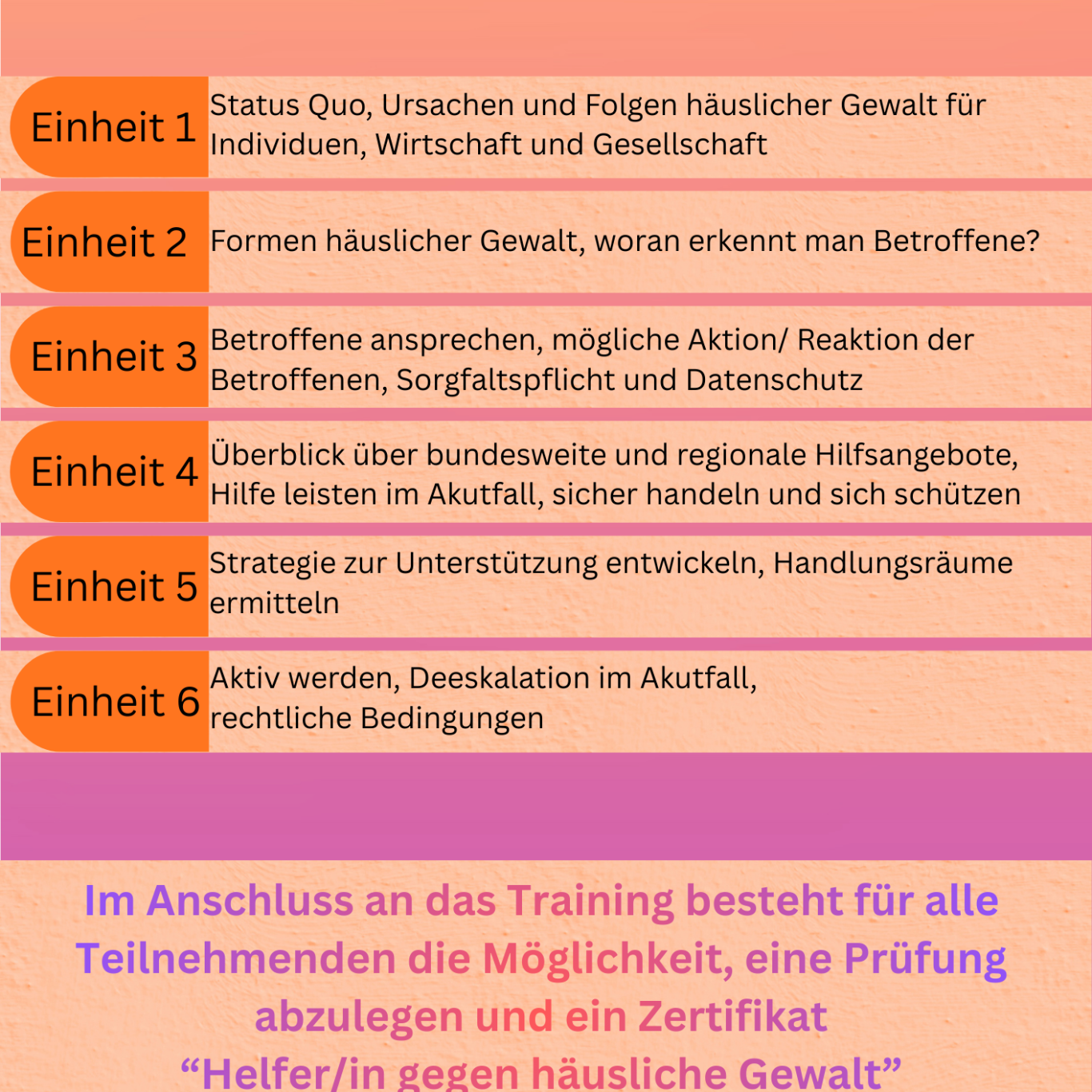 Nach Abschluss der sechs Einheiten findet eine kleine Prüfung statt, die das erworbene Wissen und die Fähigkeiten überprüft. Nach erfolgreichem Abschluss wird das Zertifikat „Ziviler Schutz vor häuslicher Gewalt“ verliehen. Dieses bestätigt, dass die Teilnehmer gut vorbereitet sind, um im Alltag Verantwortung zu übernehmen und Betroffene zu schützen.